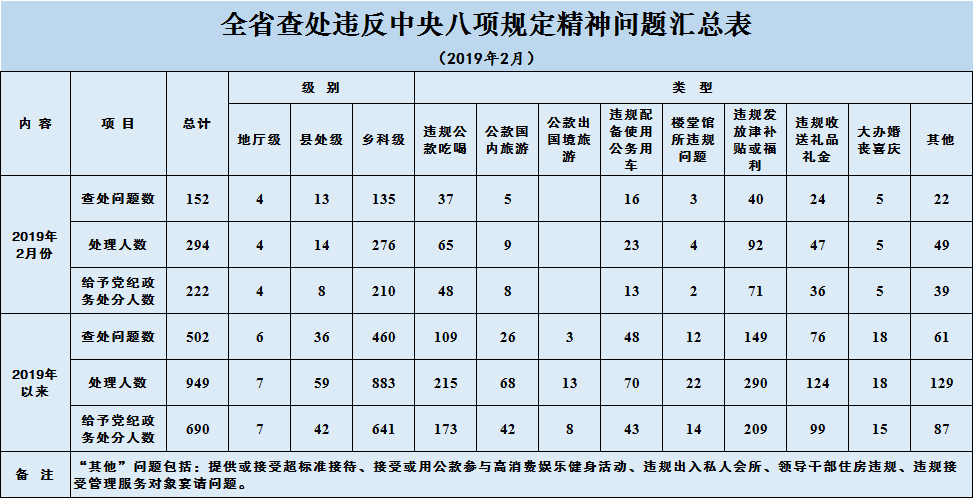2019年2月,全省共查处违反中央八项规定精神问题152起,处理294人,其中给予党纪政务处分222人。从处理干部级别看,查处地厅级干部4人、县处级干部13人、乡科级及以下干部135人。从查处问题类型看,违规发放津补贴或福利问题最为突出,有40起;其次是违规公款吃喝、违规收送礼品礼金,分别是37起、24起。这3类问题占到查处问题总数的66.4%。