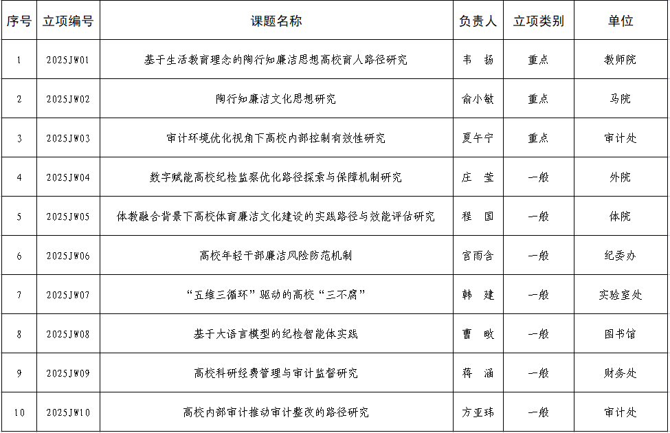 《关于做好2025年度校纪检监察审计研究课题申报工作的通知》发布以来,各单位广泛动员,广大教职工积极申报。根据工作安排和相关要求,研究课题经纪委委员和专家评审,提出立项建议。2025年度批准立项的课题总数为10项,其中重点课题3项,一般课题7项,具体如下: