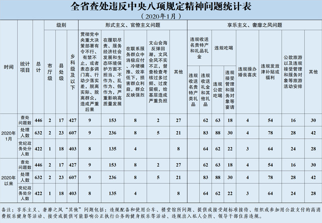 2020年1月,全省共查处违反中央八项规定精神问题446起,处理632人,其中给予党纪政务处分422人。从查处问题类型看,查处形式主义、官僚主义问题199起,享乐主义、奢靡之风问题247起。从处理干部级别看,查处市厅级干部2人、县处级干部23人、乡科级及以下干部607人。