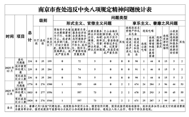 2025年12月,全市共查处违反中央八项规定精神问题234起,批评教育和处理239人,其中党纪政务处分236人。从问题类型看,查处形式主义、官僚主义问题77起,批评教育和处理79人;查处享乐主义、奢靡之风问题157起,批评教育和处理160人。从人员级别看,批评教育和处理县处级干部35人、乡科级及以下人员204人。
